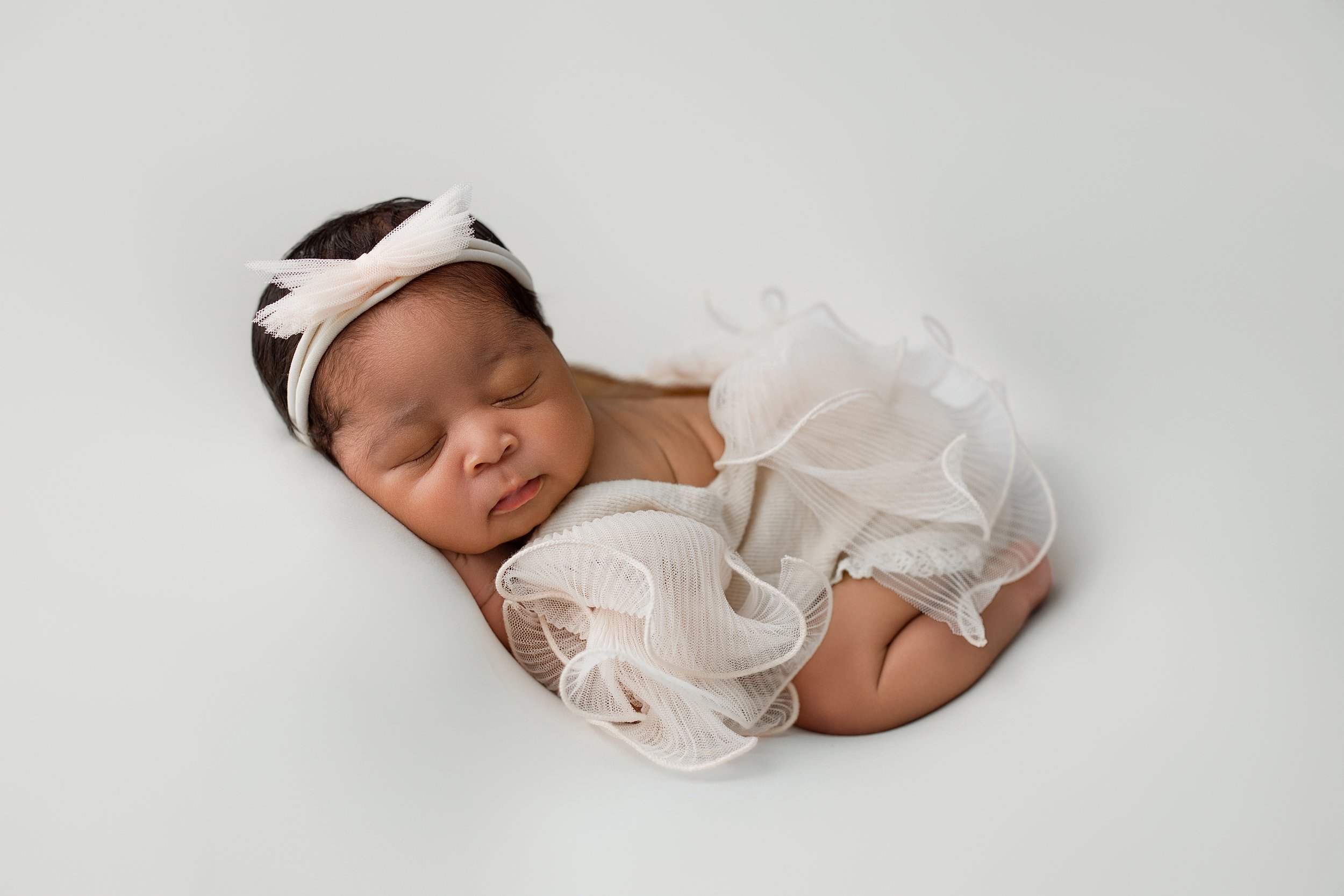 Photographed in my Rochester Hills newborn photography studio, Kadence’s session focused on soft textures, neutral tones, and timeless simplicity. Wrapped in creamy whites and gentle blush layers, she slept peacefully throughout her time in the studio, allowing me to capture her in the most natural and serene way.
