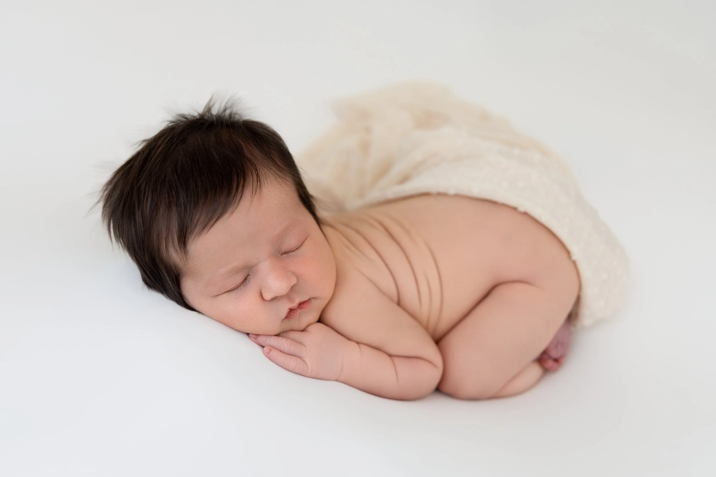 When Margo arrived, she brought a peaceful presence that translated effortlessly into her newborn session. Styled in soft neutrals, airy textures, and timeless tones, her portraits highlight everything we love about classic newborn photography—tiny details, curled poses, and a calm, organic style.